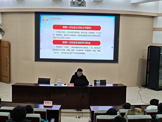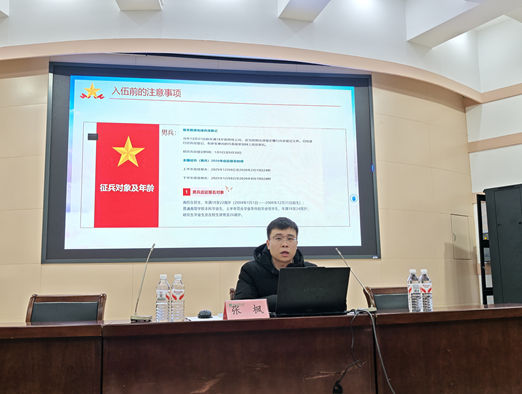 于文化路校区三百人报告厅召开新生征兵入伍宣讲会。25级全体学生参会,本次活动由院团委副书记李艳飞主持,院团委辅导员张枫主讲。
