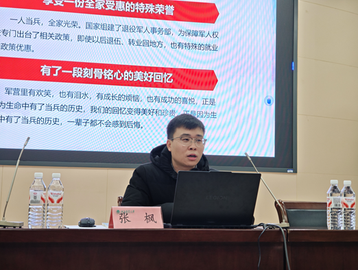 宣讲会上,张枫围绕征兵入伍条件、国防意义、优惠政策及基本流程四个核心方面展开详细讲解。在征兵入伍条件介绍环节,他重点明确了视力、体重、身高和年龄四项核心要求。随后深入阐述国防的重要意义,指出国防是国家的防务与综合性学问,直接彰显国家综合实力,帮助同学们树立“国无防不立”的认知。讲解过程中,张枫还主动与同学们互动,针对同学提出的疑问耐心解答,现场氛围热烈。优惠政策是本次宣讲会的重点,张枫逐一解读了大学生应征入伍“四个优先”、服义务兵役国家资助、退役后复学升学优惠及就业优先招录等政策,用具体红利打消同学们的后顾之忧。最后他明确了应征需遵循的政治初审、新兵预定和审批入伍原则,以及网上报名、初审初检等流程。